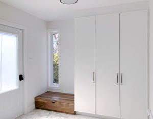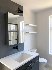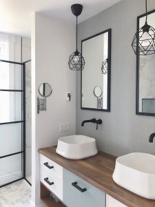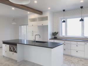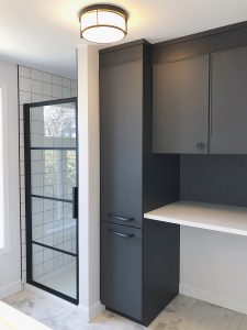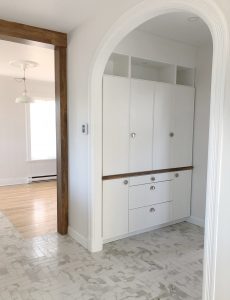 La charmante. Elle porte bien son nom puisque qu’on y retrouve tout le cachet d’une maison centenaire avec une touche moderne. Le mandat consistait à refaire l’aménagement intérieur en conservant certains éléments architecturaux. Plusieurs pièces ont été rénovées dont l’entrée, la salle de lavage, la cuisine, le foyer ainsi que la salle de bain principale. Les couleurs et les matériaux ont été choisis avec soin afin de moderniser l’ensemble des pièces pour créer une belle continuité. Le mobilier a été fait sur mesure par notre ébéniste afin de répondre aux besoins des clients pour ainsi leur donner un espace de vie harmonieux et fonctionnel. Projet réalisé en collaboration avec Marie-Eve Chouinard, technologue en architecture.