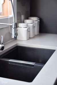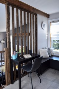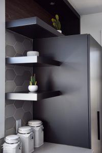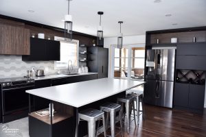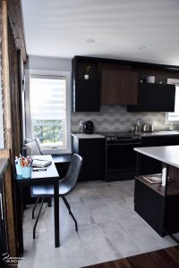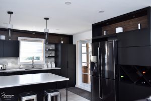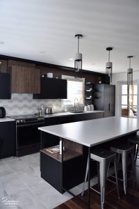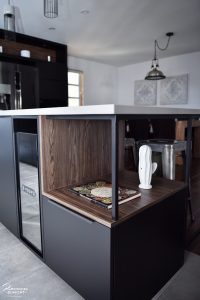 Merci à ma cliente qui m’a laissé carte blanche. Elle m’a dit : Fais TA cuisine de rêve! Alors la voici ma cuisine de rêve. Ses lignes droites ainsi que les mélanges de matériaux et de textures la rendent unique. J’ai choisi de travailler avec le noyer pour sa chaleur qui crée un beau contraste avec le côté brut du comptoir de quartz effet béton. Un coin bureau-banquette a été aménagé pour ainsi faciliter les devoirs et la vie de famille. Une cuisine design, mais aussi fonctionnelle!