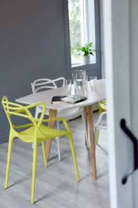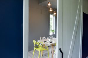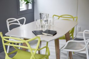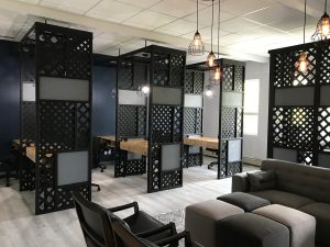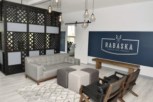 Rabaska est un espace collaboratif de type “coworking” où il est possible de louer un emplacement afin d’y travailler et de profiter des équipements et services offerts sur place. Son nom image bien la nature qui nous entoure, mais aussi l’esprit d’équipe. Nous ramons tous ensemble, dans une même direction, ce qui représente l’avancement. Mon mandat était d’exploiter l’espace disponible au maximum afin d’y créer des bureaux avec une certaine intimité tout en gardant une aire ouverte, en plus d’ajouter une salle de conférence et un espace de repos. Afin de rester dans le même esprit, je me suis inspirée de la thématique du rabaska en utilisant des matériaux bruts ainsi que des couleurs neutres qui passeront bien le temps.